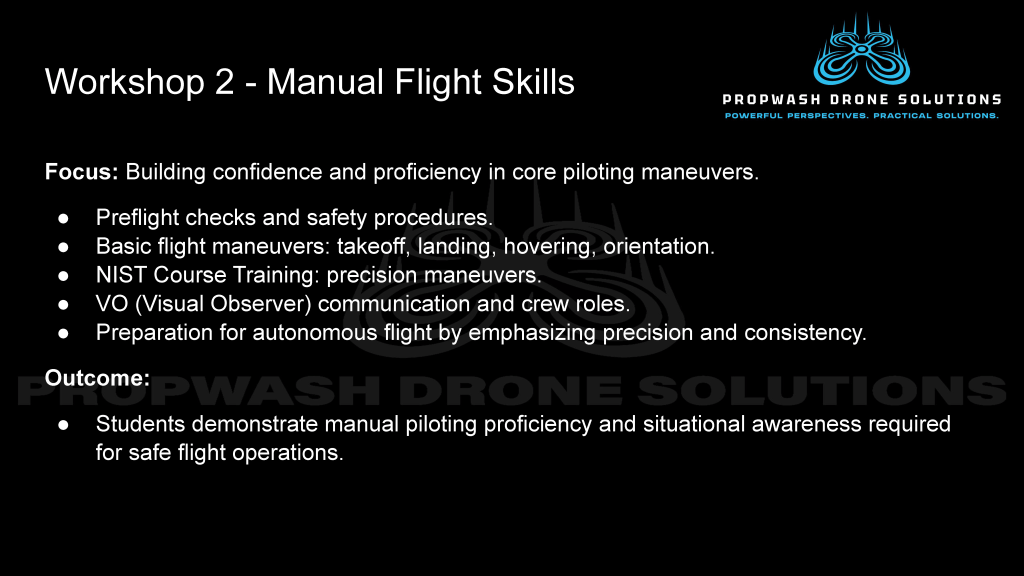 A turnkey training package covering the fundamentals of safe, compliant, and professional drone operations. Covers 1. Regulations & Operational Requirements, 2. Manual Flight & NIST Open Lane, 3. Mapping & Modeling, 4. Inspection Operations. Includes complete instructor and student materials, practical flight exercises, and scenario-based activities.