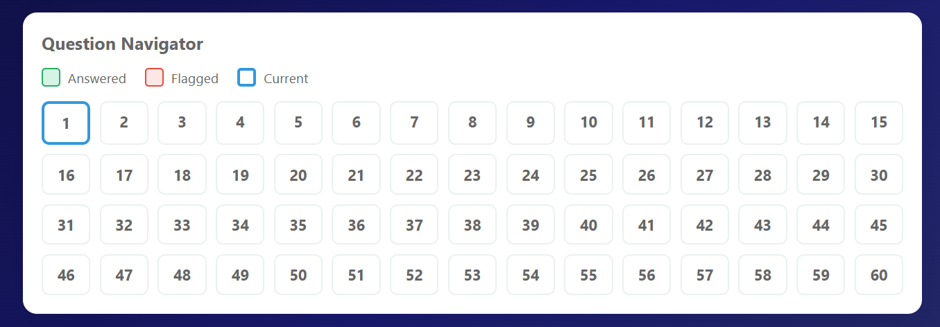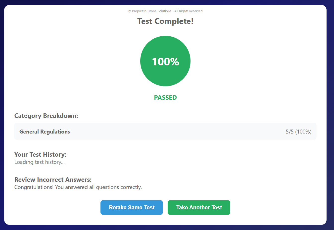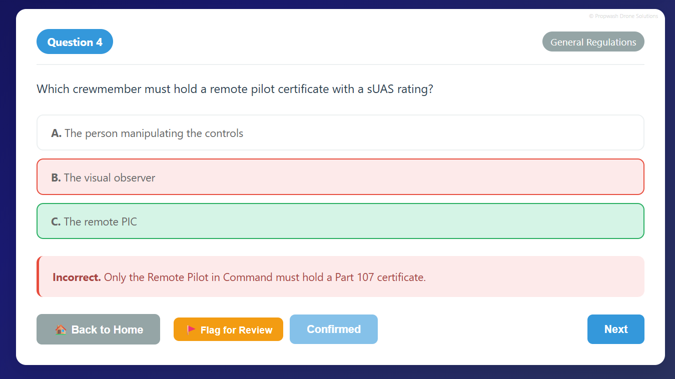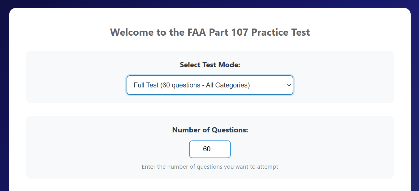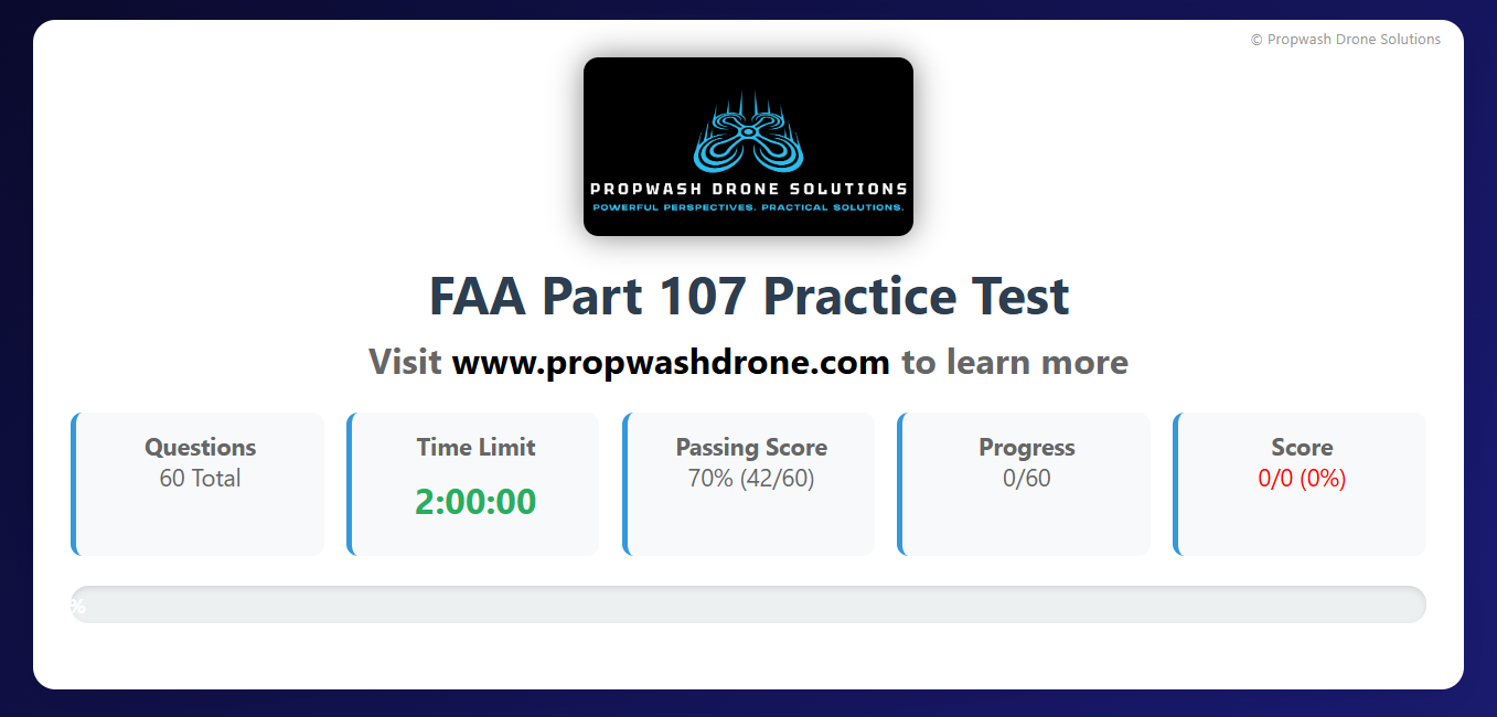 A streamlined, browser-based study program built to help new remote pilots pass the FAA Part 107 Knowledge Test with Confidence. Includes hundreds of practices questions, detailed explanations, topic selection, retakes, and attempt history. Optimized for both desktop and mobile study.
